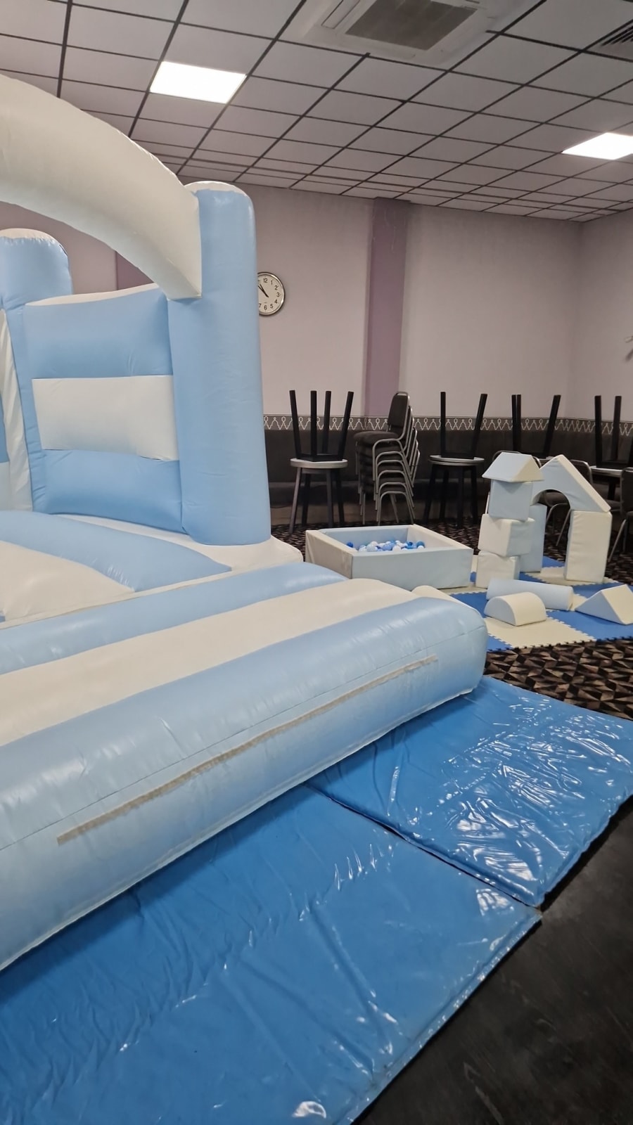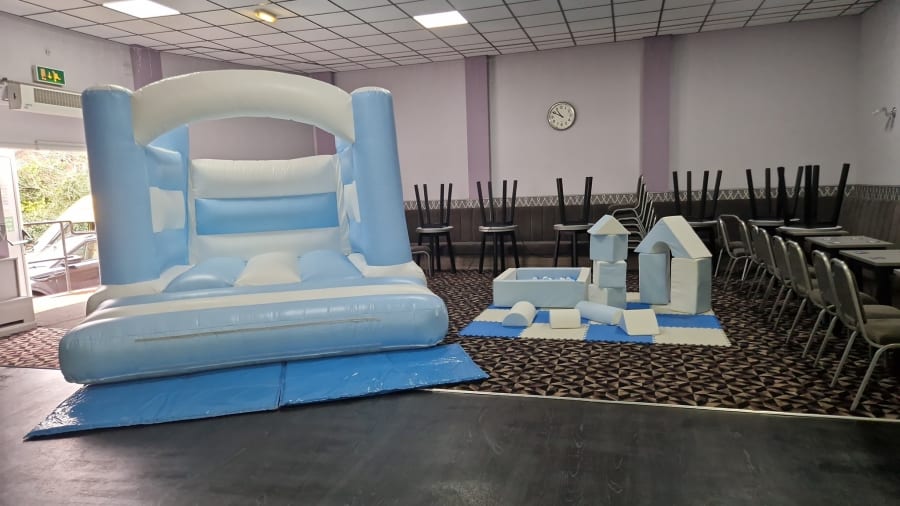 This Package includes a 10x12 ft bouncy castle, its 8ft tall so perfect for most venues, includes a ballpool with white and blue balloons, play shapes and floor matts