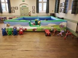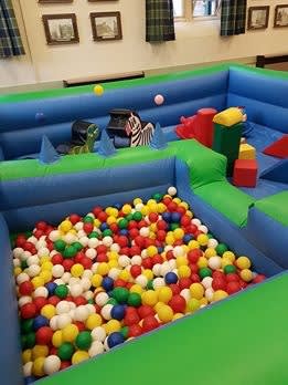 Our play surround is 15ft x 15ft with a 7ft built in ballpool with integrated air jugglers.