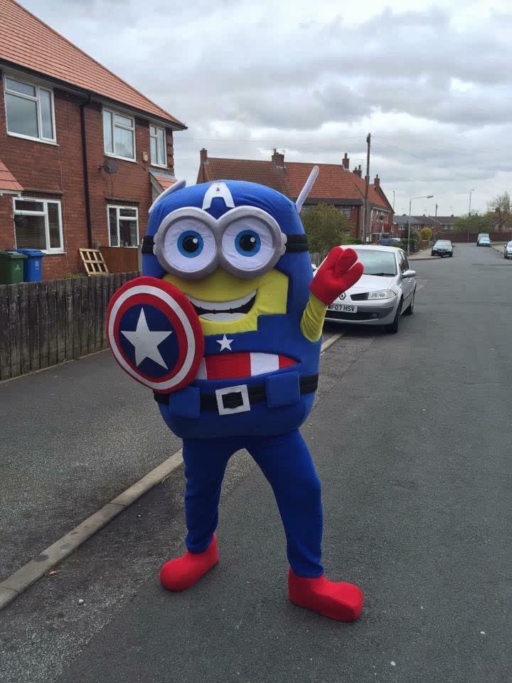 Captain america minion mascot costume hire in Rotherham, Sheffield, Worksop and the surrounding areas.