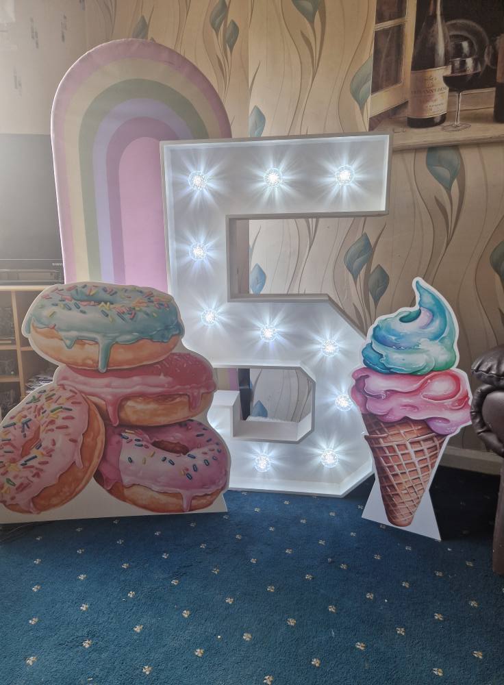 This package includes light up number of your choice, our rainbow arch, and 2 large cut outs including dounuts and a icecream