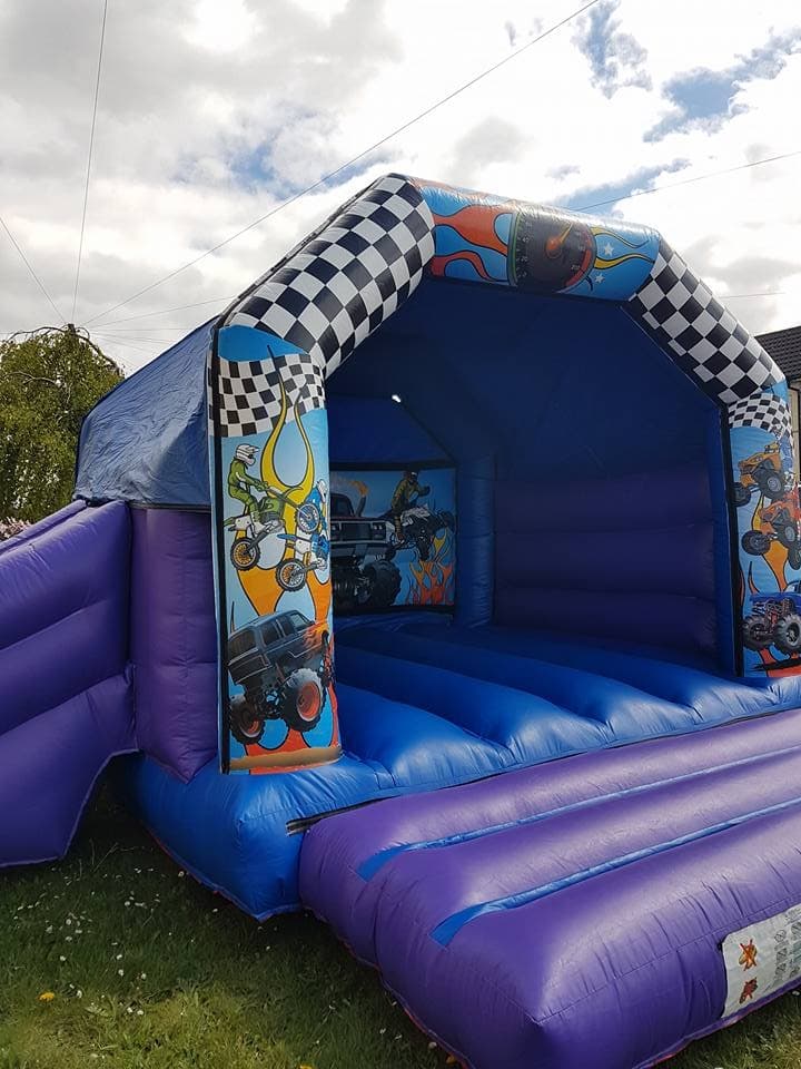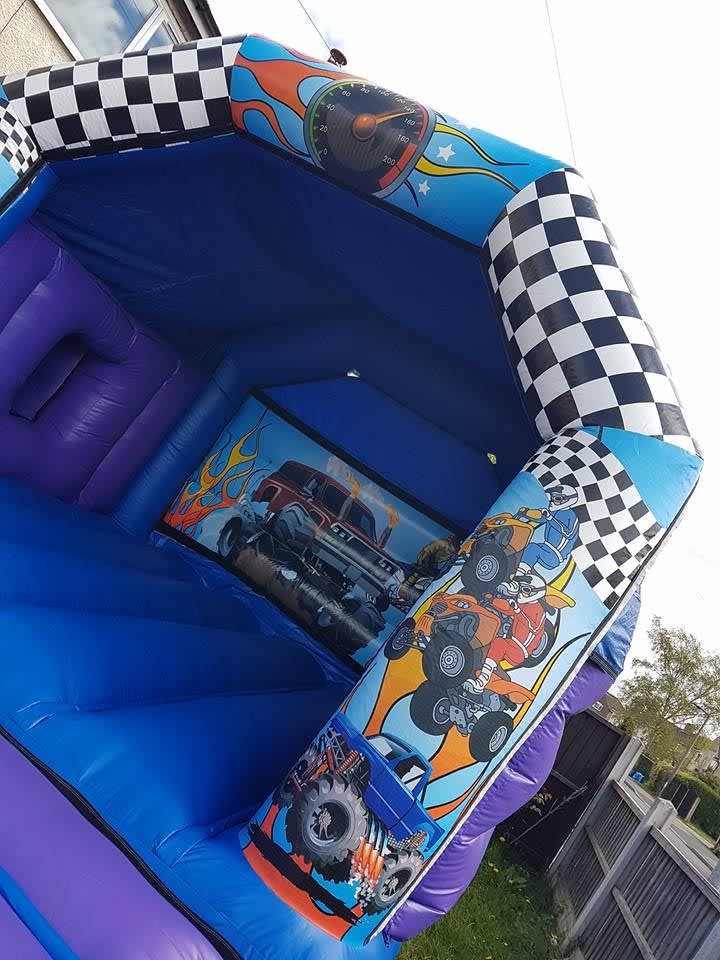 Our transortt bouncy castle is very popular at adult parties - weddings, adult birthdays, children parties and occasions of any kind. The front panels feature racing cars and flags.